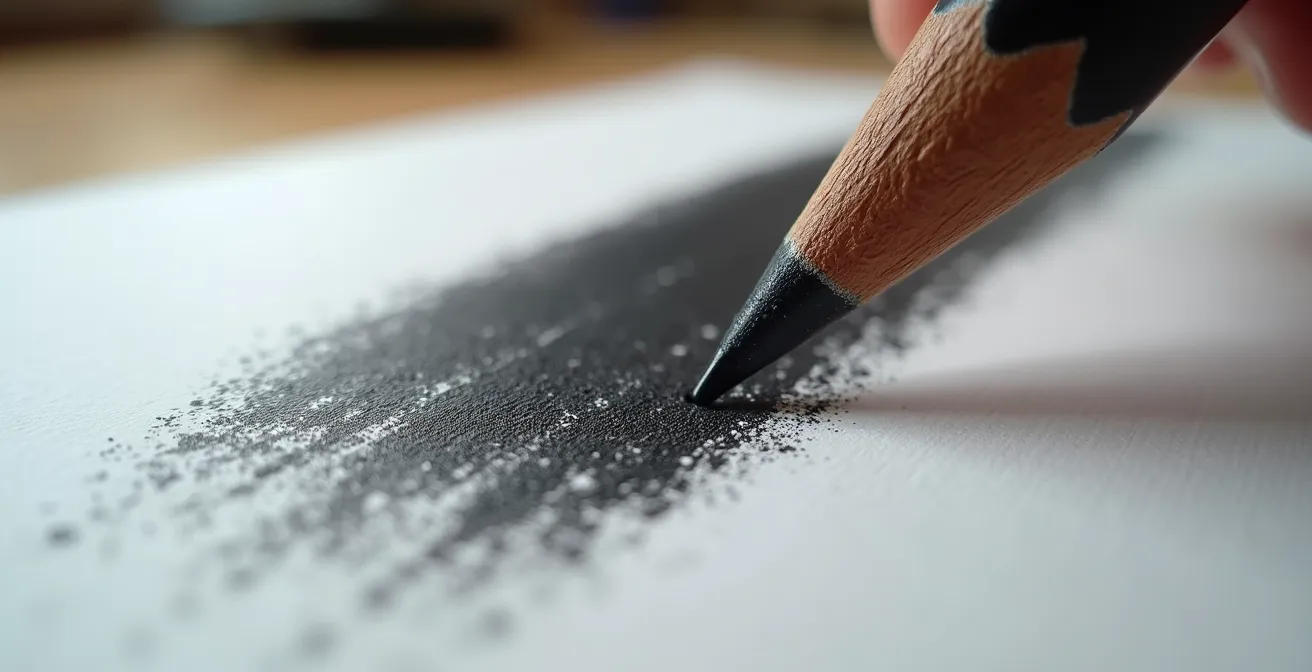 L’erreur du débutant est de vouloir créer des valeurs dès l’esquisse en appuyant sur un crayon trop tendre. Cela a deux conséquences désastreuses : le graphite s’incruste profondément dans le papier, rendant le gommage difficile et laissant des « fantômes » ; et cela lisse le grain du papier, l’empêchant d’accrocher correctement les couches de graphite suivantes. Utiliser un 4H avec une pression calibrée et minimale préserve l’intégrité de votre surface de travail, garantissant une meilleure réception pour les dégradés à venir.